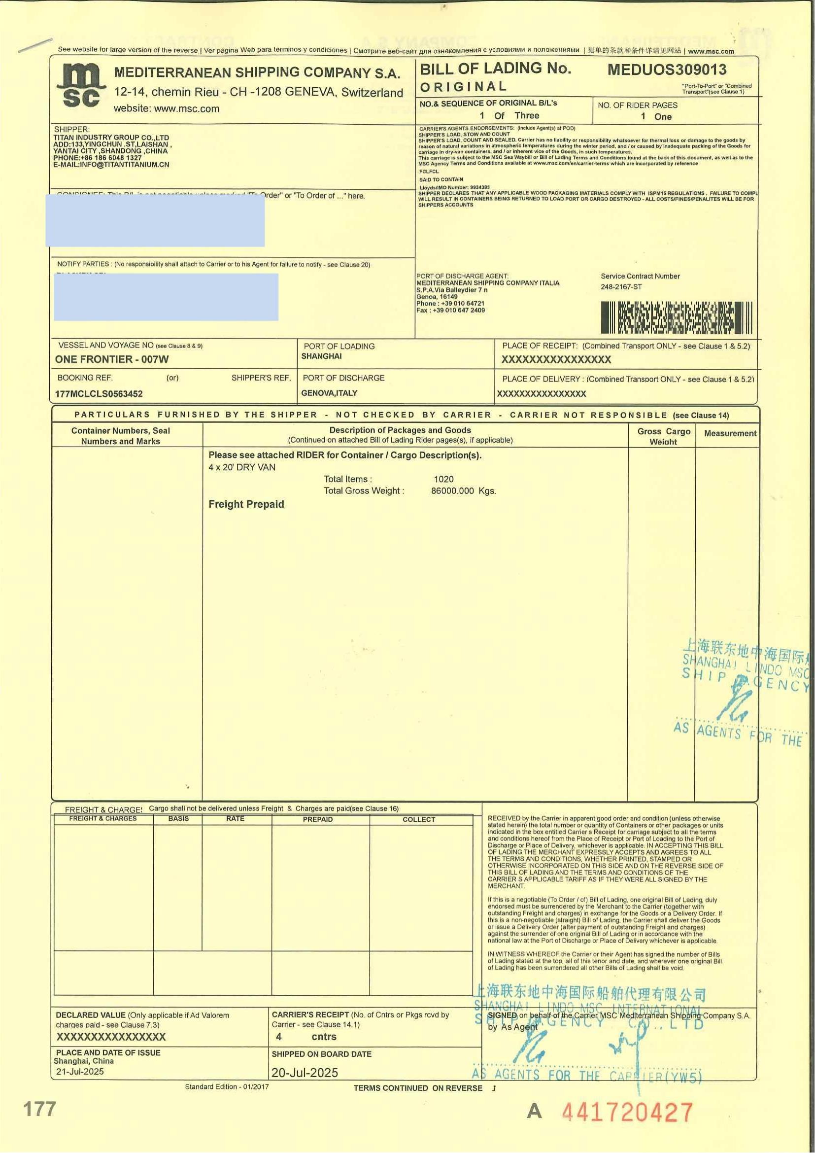 BILL OF LADING 2025.7.23 FOR 86MTS TIO2 CHTI TO EU MARKET ,BEST CHOICE FOR ANTI-DUMPTING DUTY2025-07-26