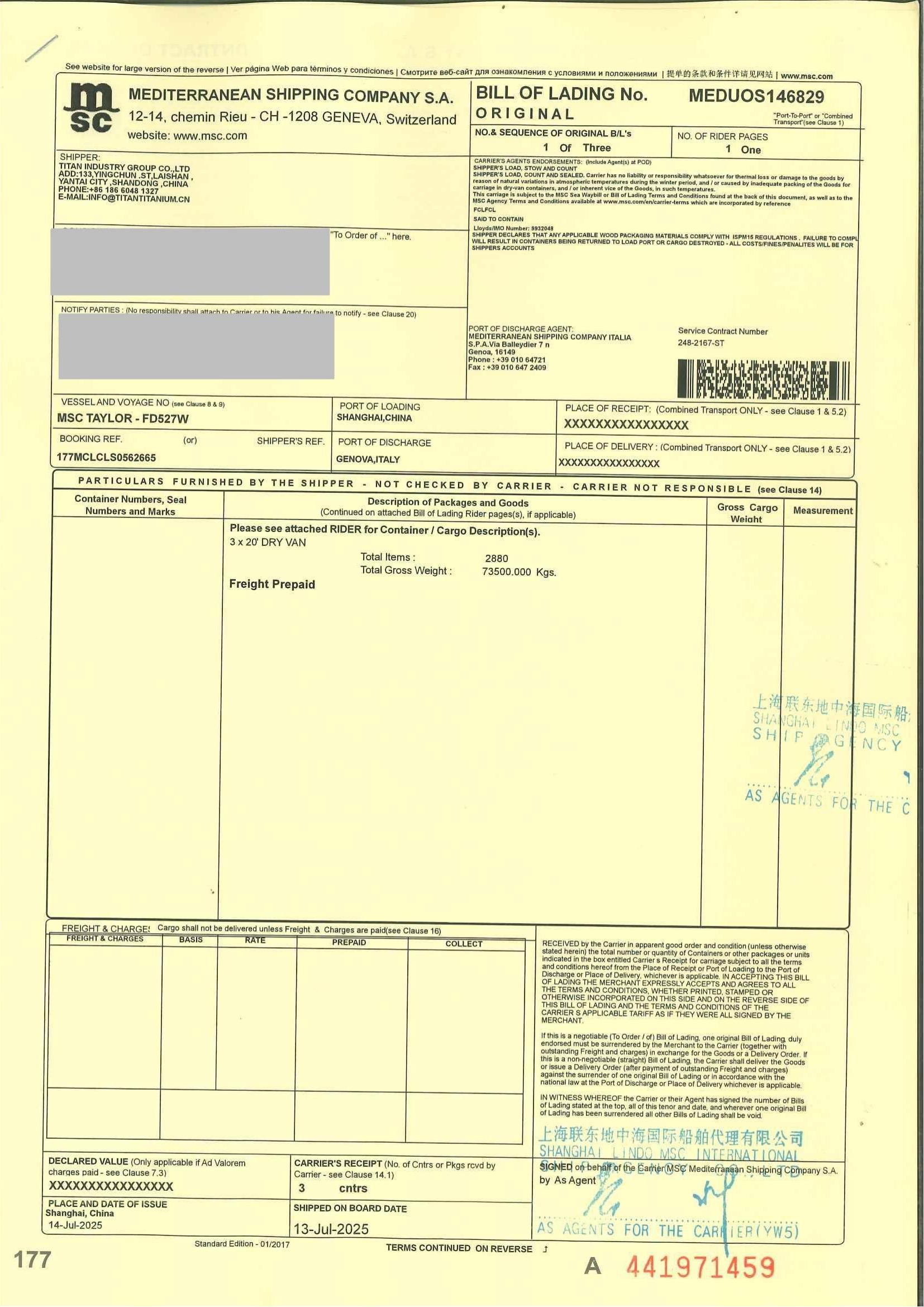 BILL OF LADING 2025.7.23 FOR 86MTS TIO2 CHTI TO EU MARKET